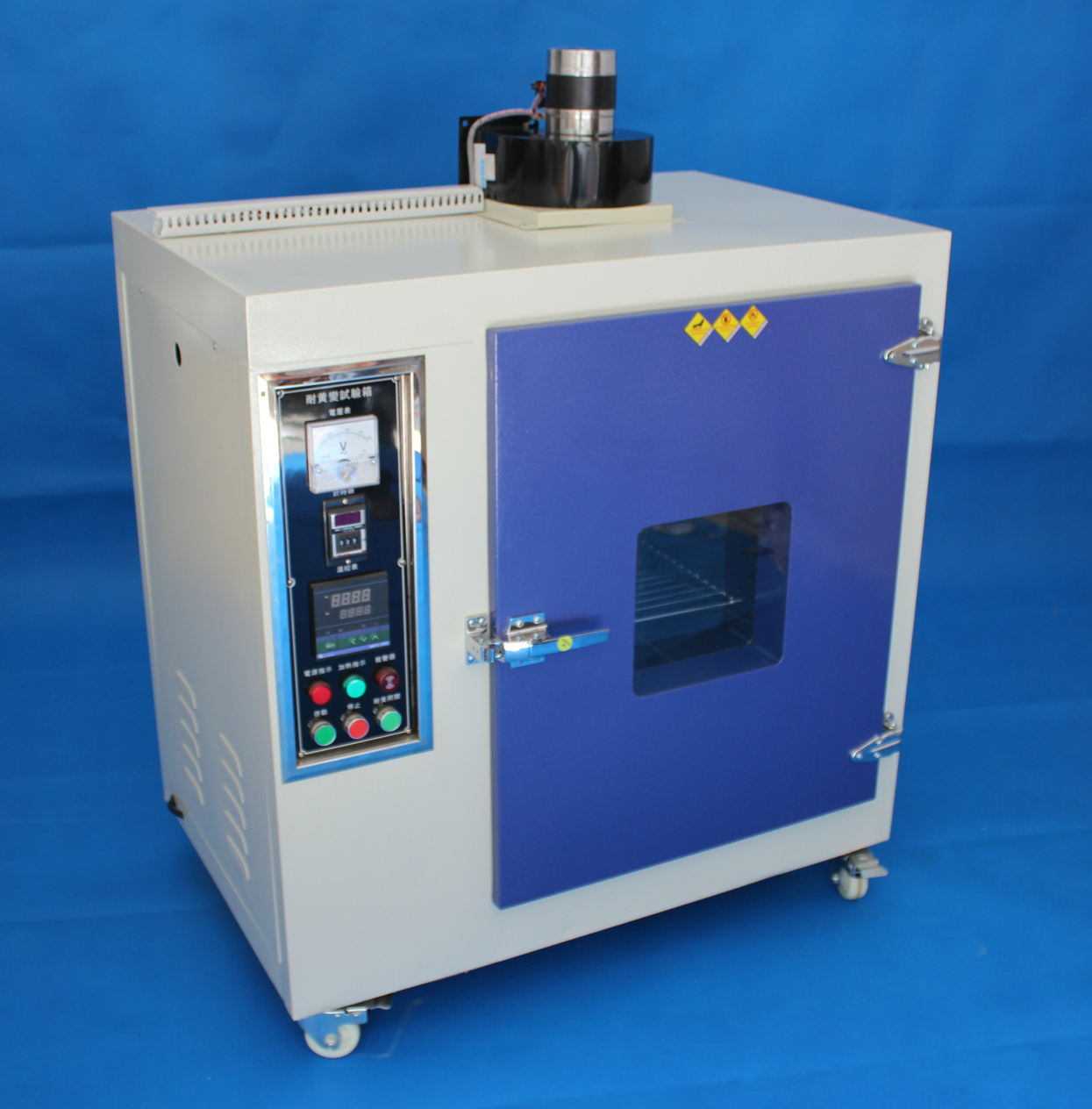 用于材料的黃變加速試驗(yàn)(一般在70℃時(shí)材料此箱內(nèi)試驗(yàn)3小時(shí)相當(dāng)于自然界環(huán)境中2個(gè)月黃變結(jié)果)。可用污染灰色標(biāo)做參判定材料黃變等級(jí)。也可以目測(cè)材料的黃變程度